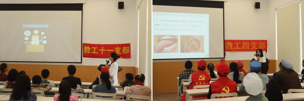 揭牌仪式后,口腔医(学)院以专业和孩子们的天性为出发点组织开展了系列活动。修复种植科程余婷及预防及儿童口腔科任晓喻分别作题为“假牙那些事儿”、“口腔卫生保健知识讲座”科普讲座;本科生党支部开展了“一心向党 与史‘童’行”趣味党史宣讲;张军梅及何雨羲带领当地留守儿童共唱《没有共产党就没有新中国》,为党的生日献礼;王永为小朋友们讲解绘画技巧,教导大家手绘牙齿,并在画纸上描绘出对祖国的美好祝愿;活动最后,口腔医(学)院医护团队现场组织义诊活动,现场前来咨询的市民络绎不绝。