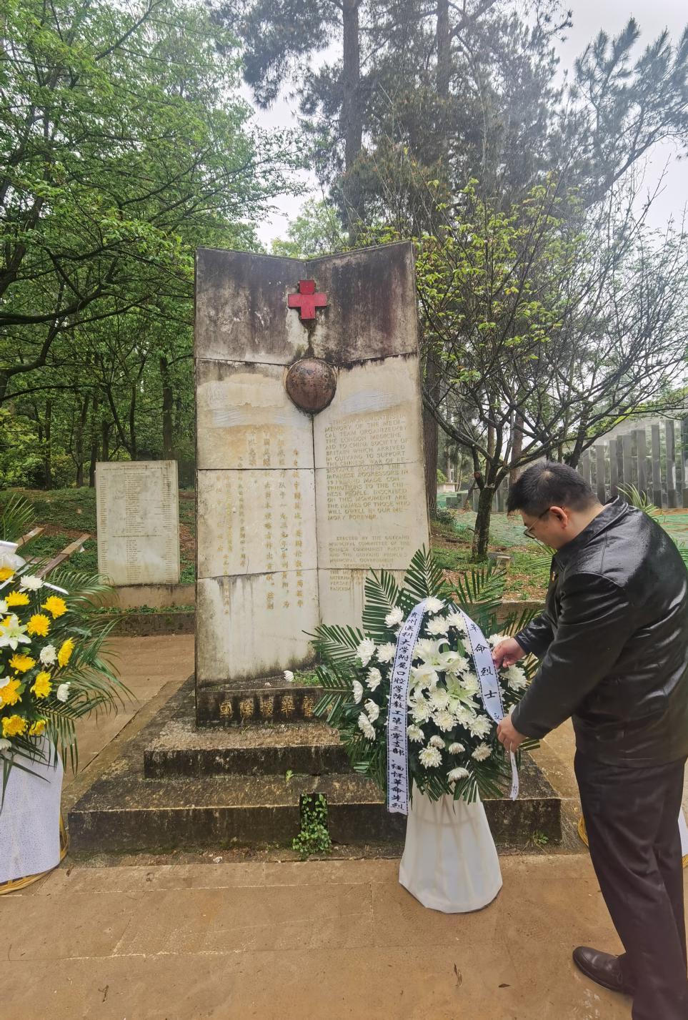 活动现场,党员同志们身着正装、神态严肃,表达对革命先烈浓浓的尊敬之情观摩中国红十字会救护总队革命先烈在80年前发生在图云关的英勇事迹,支部书记刘睿向烈士墓碑敬献了花篮,支部全体党员肃立默哀,寄托哀思。随后,参加活动的人员依次到烈士墓碑前致献菊花。