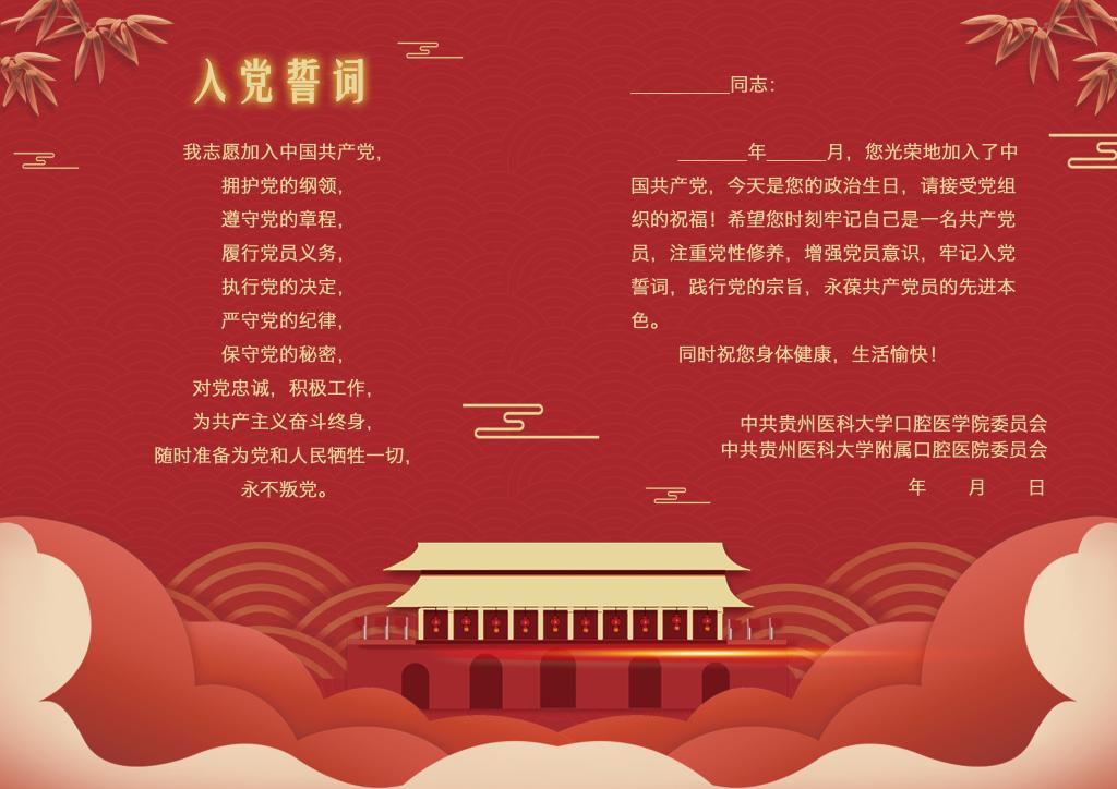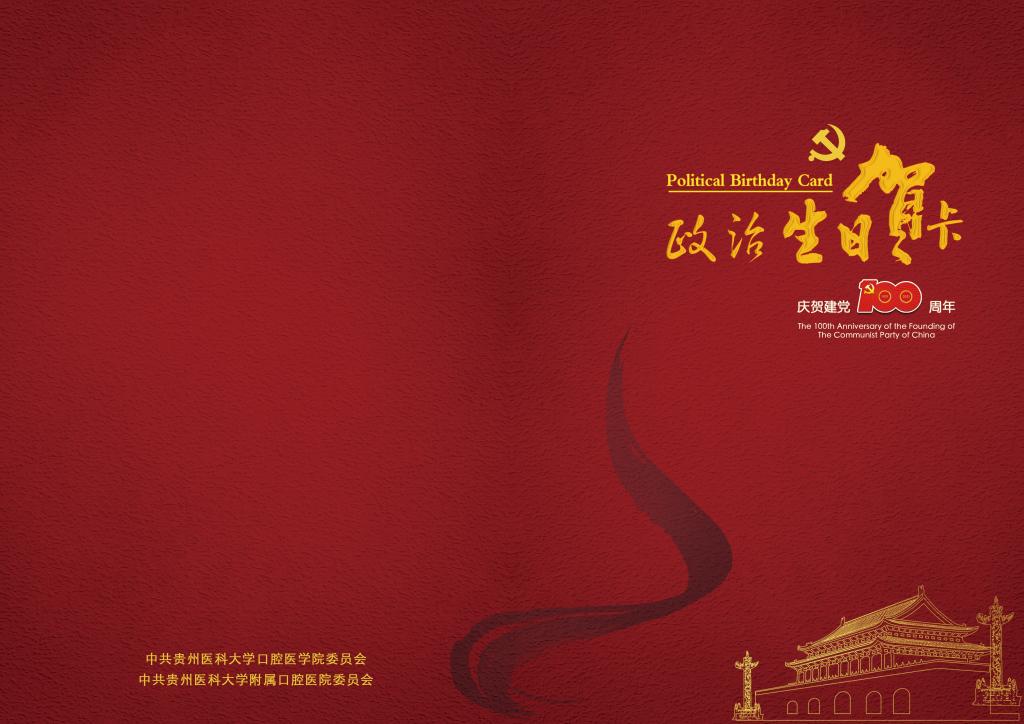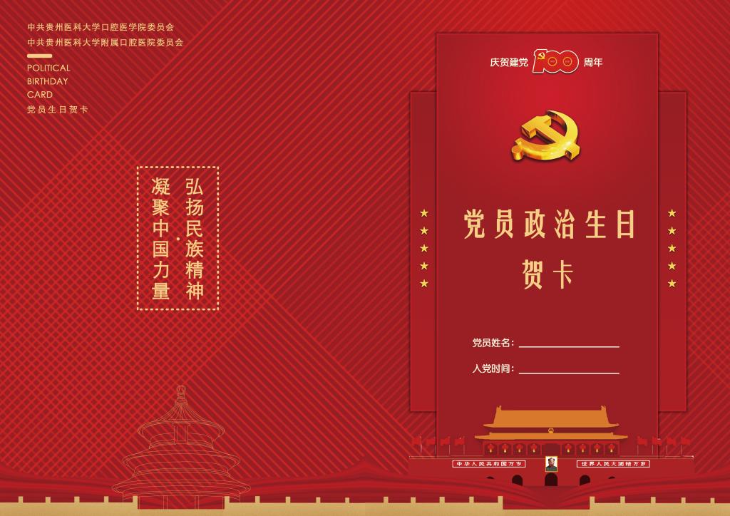党员政治生日贺卡由两部分组成,即外壳和内页。外壳由党徽、庆祝建党100周年活动标识和金黄色“政治生日贺卡”文字组成。内页分内外两侧,内侧有入党誓词,党员入党的基本信息及祝福语,外侧有100周年庆祝活动标识、党徽、党员姓名和入党时间,并写有“凝聚中国力量.弘扬民族精神”文字,同时内外都有两院信息,希望全体党员铭记入党誓词,严格要求自己,为中华民族伟大复兴贡献力量。
