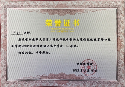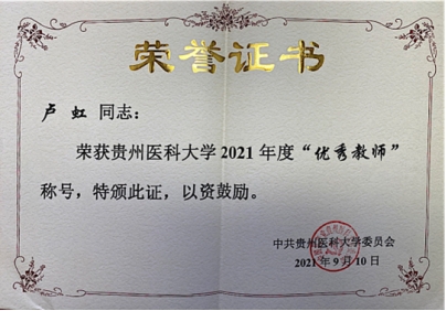 “优秀职工”称号;2021年被评为贵州医科大学“优秀教师”和院级住培优秀带教老师;2022年获第二届全国高校教师教学创新大赛校级选拔赛副高组三等奖,同年获91直播