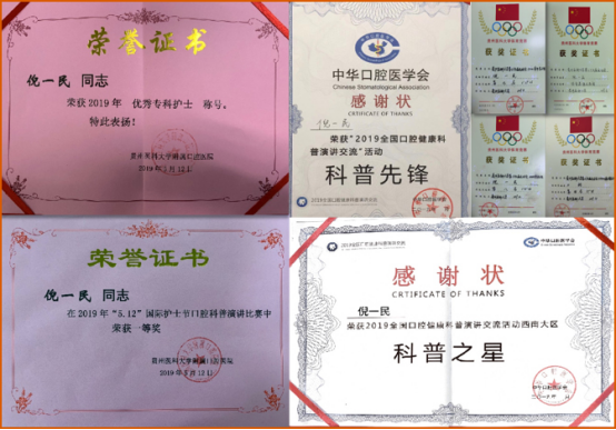 护理部举办的“人人享有口腔健康”科普演讲比赛中荣获一等奖;7月参加全国口腔健康科普演讲交流活动荣获西南大区一等奖“科普之星”;9月参加全国口腔健康科普演讲交流活动荣获三等奖“科普之星”;2019年参加贵州医科大学第三十九届运动会荣获“体育道德风尚奖”;2020年被评选为91直播