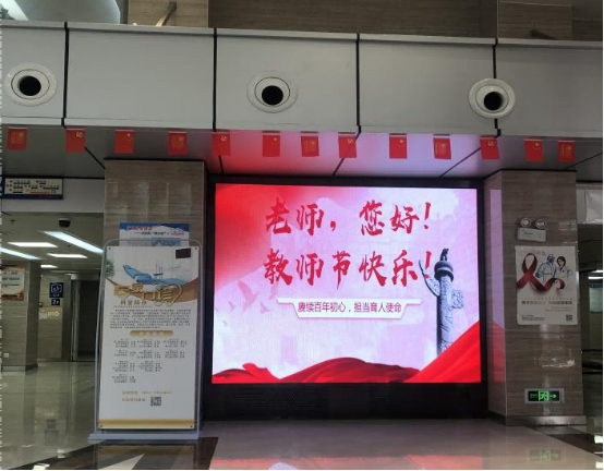积极响应教育部2021年为教师亮灯公益活动要求,将主题词为“老师您好!”“教师节快乐!”“赓续百年初心,担当育人使命!”的祝福语在附属口腔医院公开的电子屏幕上进行宣传,引导师生感念师恩,礼敬教师,营造浓厚的节日氛围。