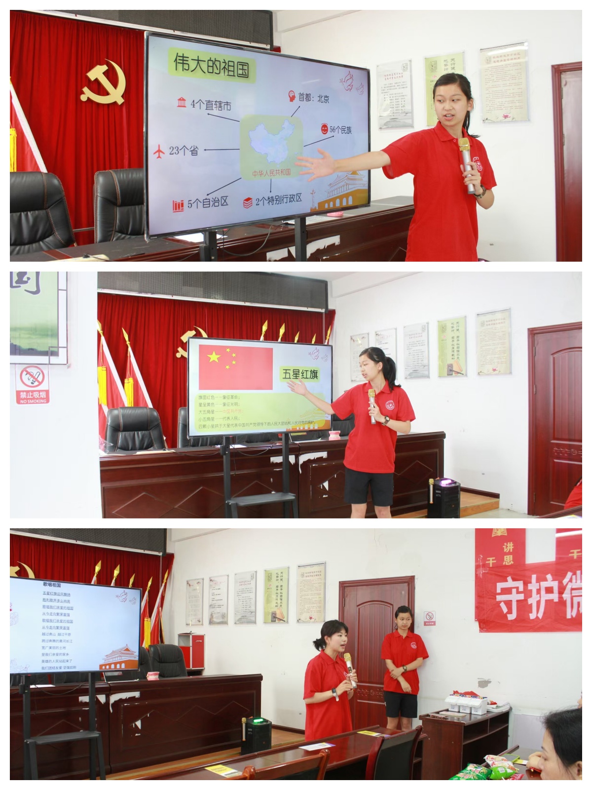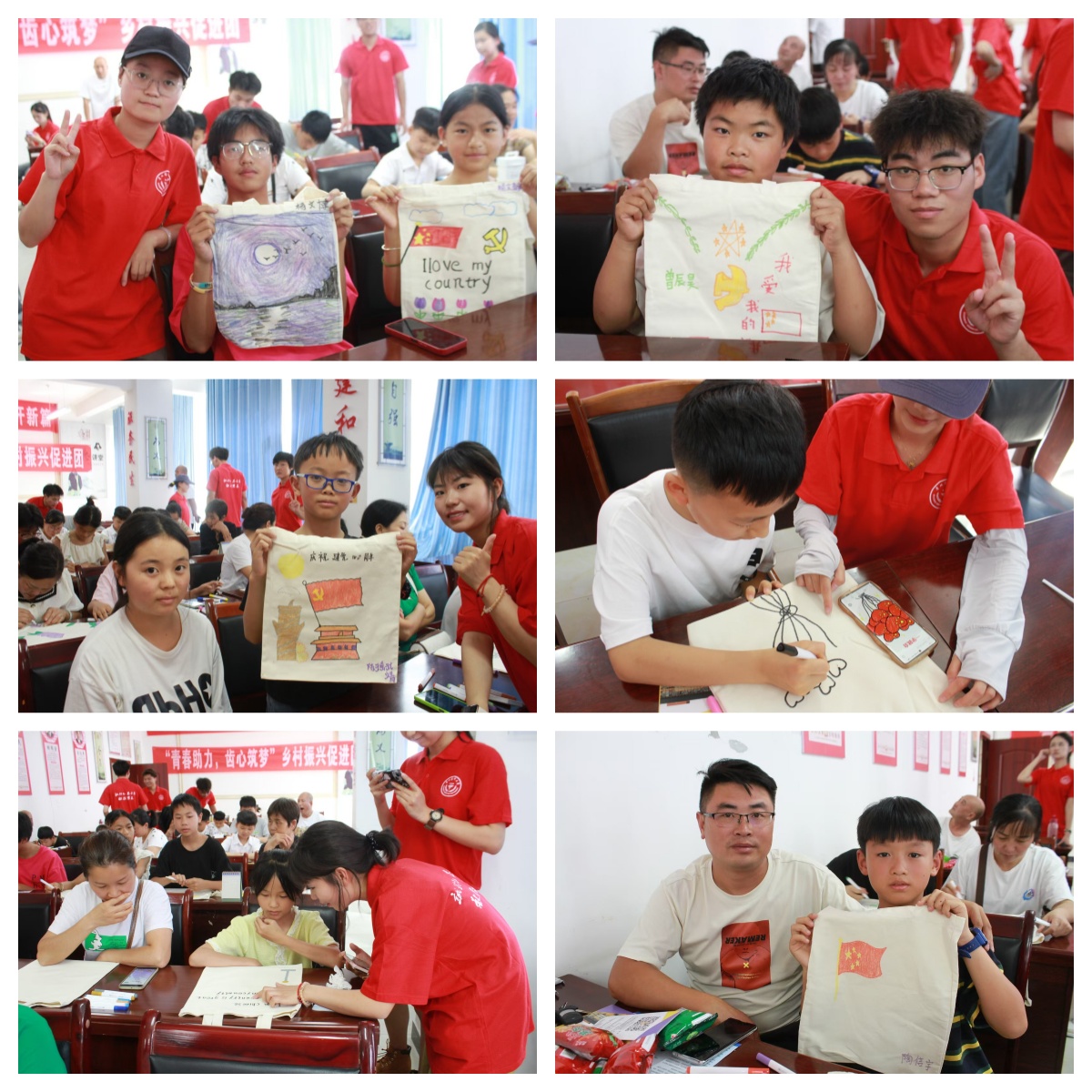 实践队为小朋友们讲解了中国国旗、国徽、国歌及中国地图的含义,带动小朋友们学唱歌曲《歌唱祖国》,在活动的末尾,志愿者们为每个小朋友分发了一个帆布包,让他们执画笔绘中国。