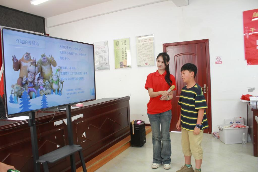 推广普通话是提升国民文化素质、促进社会和谐的重要举措,普通话作为国家的官方语言,不仅是沟通交流的工具,更是文化传承的重要载体。此次三下乡活动,实践队队员以一部家喻户晓的动画片《熊出没》为引,向小朋友们推广了普通话,使他们了解到普通话的重要性。普通话的普及不仅能消除方言隔阂,增强民族凝聚力,还能促进经济发展和社会进步。