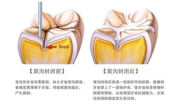 我们的磨牙咀嚼面上不是平整光滑的,而是有一些细小的沟缝,窝沟封闭就是把一层高分子的树脂涂料涂在牙齿的沟缝上,给牙齿提供一个保护性的屏障。就像给牙齿穿上了一件保护外衣,有效地抵抗食物和细菌的侵蚀,从而增加牙齿的抗龋能力。