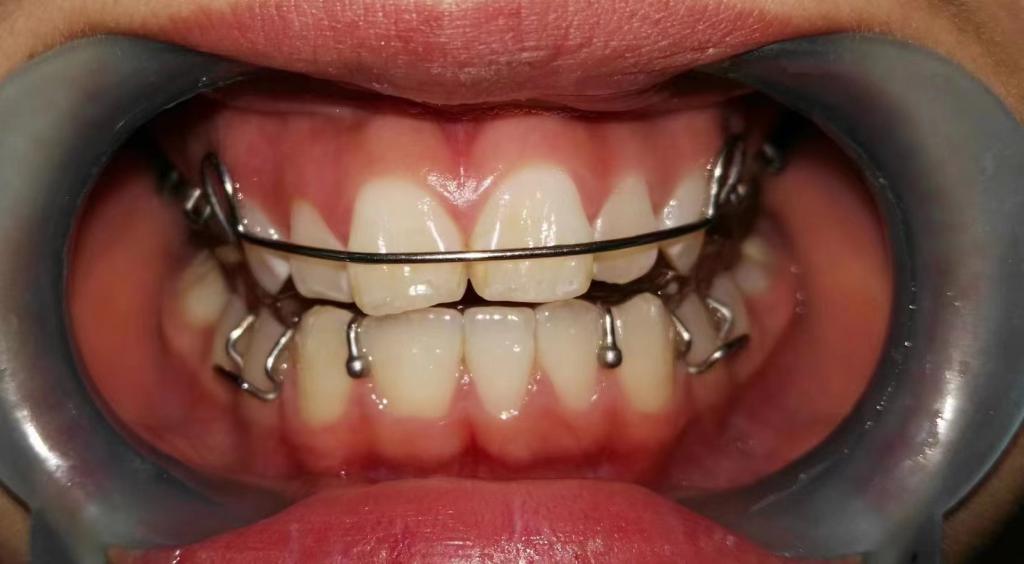 矫治方法:前牙深覆合深覆盖的患儿常常伴有吮指,咬下唇,口呼吸等不良习惯,同样,应首先纠正其不良习惯,必要时可在其手指上涂抹苦瓜汁或是辅助矫治装置如唇挡丝、前庭盾等。同时早期可进行肌功能训练,如上唇肌张力训练。口呼吸习惯应进行耳鼻喉科会诊处理,检查其是否伴有鼻咽部疾病,排除鼻咽部疾病后,再使用前庭盾、闭口贴等纠正。针对功能性的因素,常用的矫治器为肌激动器,TB、FRⅡ。针对骨性的因素,常用的矫治器为头帽-肌激动器。