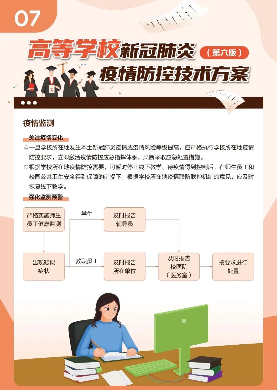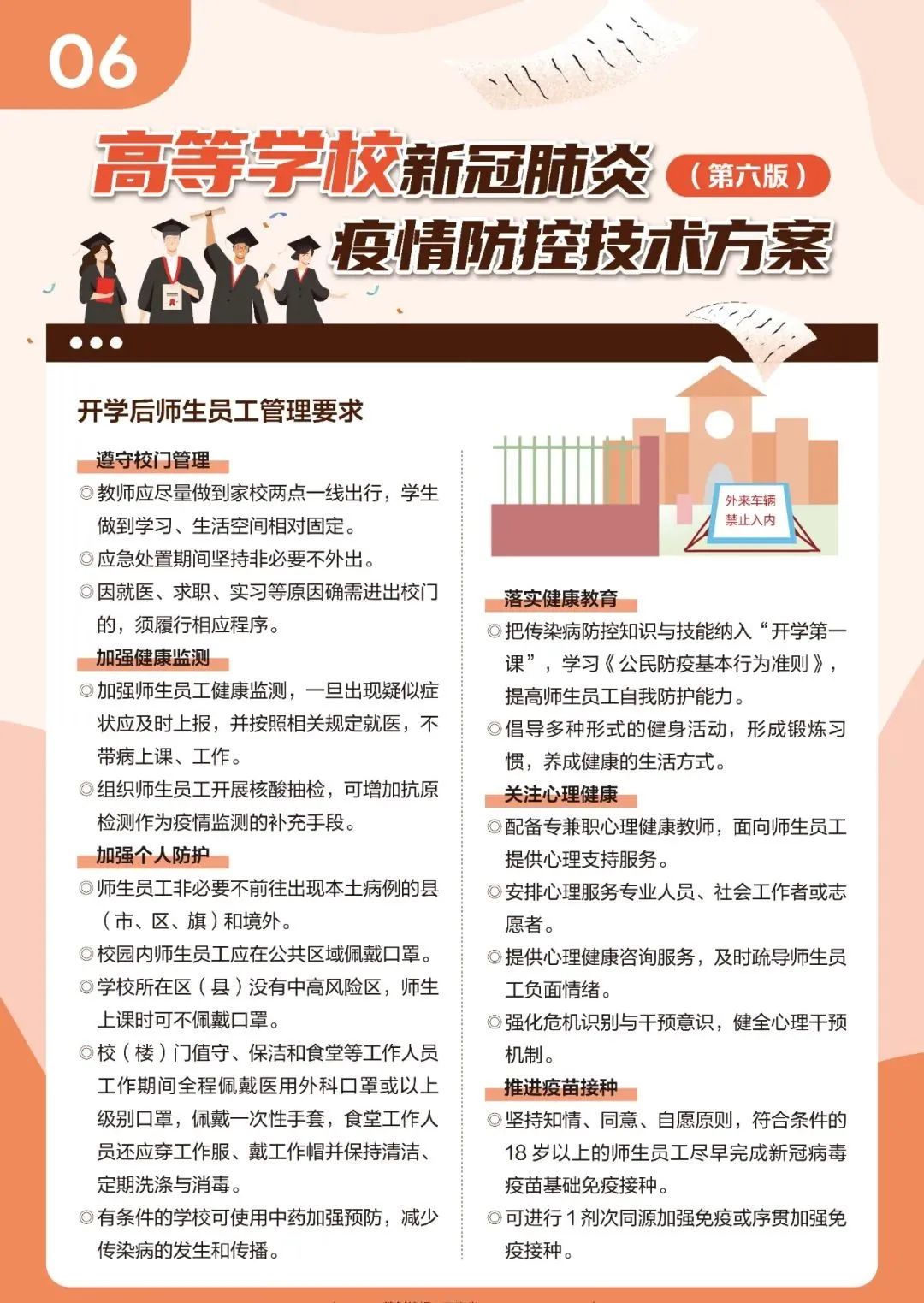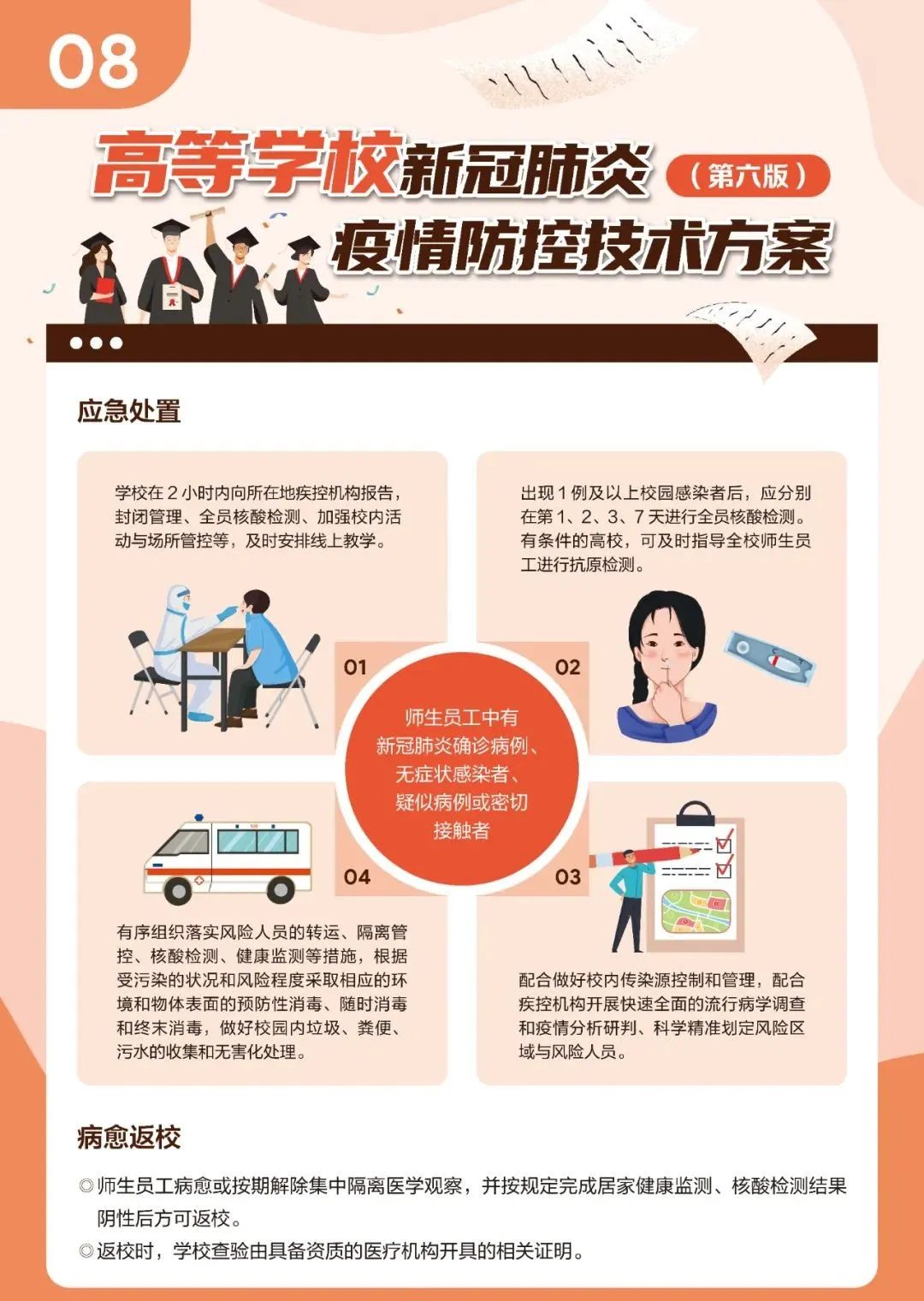 近日,教育部、国家疾控局组织制定了《高等学校新冠肺炎疫情防控技术方案(第六版)》,以进一步指导高等学校做好新冠肺炎疫情防控工作,压实校园防控各方主体责任,有序落实常态化防控与应急处置措施。新版技术方案重点都有哪些些要求?一起来看!