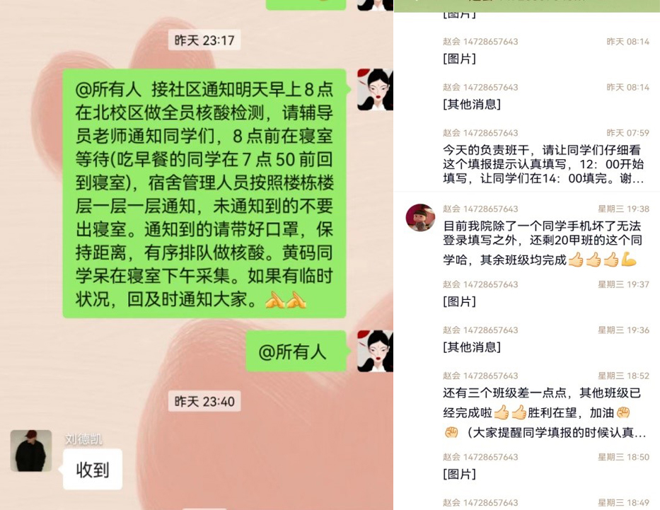 他们是唠叨“管家婆”,面对不认真完成每日安全信息上报、思想态度不积极的同学,他们反复做工作,将疫情防控宣传和思想政治教育工作结合,引导学生“战疫情,共前行”,让正能量萦绕在学生心中,积极配合学校防疫工作,坚定战胜疫情的信心和决心。