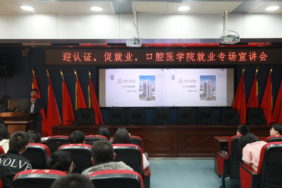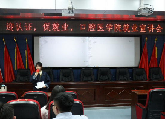 为进一步推动就业工作,拓宽毕业生就业渠道,帮助学生全面了解当前就业形势与政策,同时也为招聘单位与学生搭建沟通平台,3月9日,口腔医学院邀请常熟玉蕙口腔医院有限公司、海南口腔医院有限公司、京州口腔医疗有限责任公司、广州德仁口腔医疗有限公司在行政楼五楼学术报告厅举办“迎认证,促就业,口腔医学院就业宣讲会”,宣讲会由毕业班辅导员赵会主持。